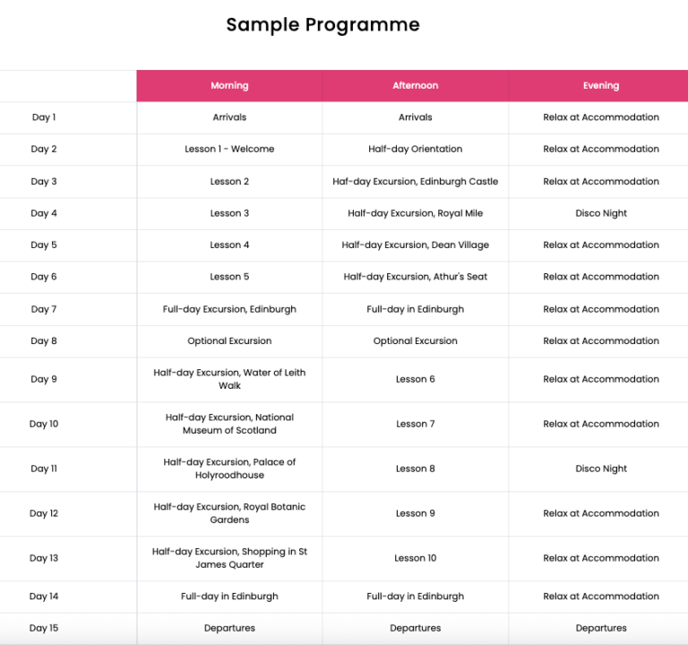 Oxford International Edinburgh 夏令營針對 12至17歲學生設計,每週提供15 小時 General English(一般英語)課程,課程程度涵蓋Elementary(初級)至 Proficiency(精通級),可依學生需求調整至較基礎程度。每班最多20 人,確保學生能獲得充分的師生互動及個別指導。課程重點是讓英語在生活中活起來,透過專題、小組合作與情境練習,學生在真實情境中學會聽說讀寫能力。
