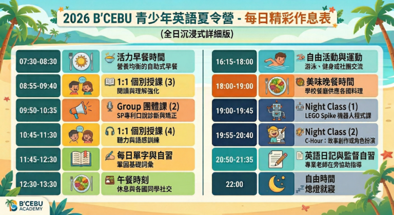 讓孩子在暑假開啟語言與科技的雙重冒險!來到菲律賓宿霧,不僅能沉浸在全英語的學習環境,更能親手開啟通往未來的科技大門。在 B'Cebu 國際英語學院,孩子不只在專業一對一課堂中突破口說瓶頸,更能在專屬的 STEM 機器人課程 中,用英文學習 LEGO Spike 程式設計 (Coding),在動手實作中鍛鍊邏輯思維與解決問題的能力。 在這裡,孩子將入住安全舒適的飯店式校園宿舍,在 24 小時全方位照護下,與來自世界各地的同齡學員共同生活、建立深厚友誼。週末更安排了熱情的海島跳島與文化探索,讓孩子在陽光與沙灘間實踐所學。這是一個兼具 語言力、數位競爭力與國際視野 的全方位暑假體驗,讓孩子在這個夏天收穫的不僅是流利的英文,更是領跑未來的自信與珍貴回憶!
